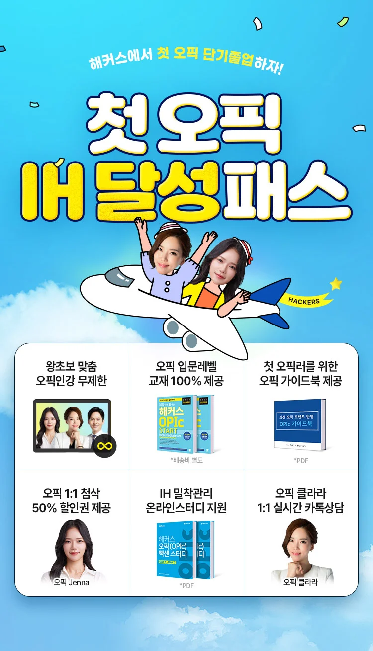 해커스 첫오픽 IH 달성패스는 오픽 IH 맞춤 강의를 수강기간 동안 자유롭게 수강하실 수 있는 이벤트입니다.