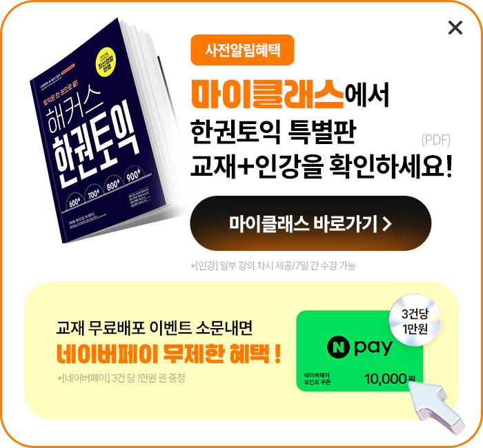 - 로그인 후 사전 알림 신청 시 전원 토익 0원패스 5만원 할인쿠폰이 지급됩니다.