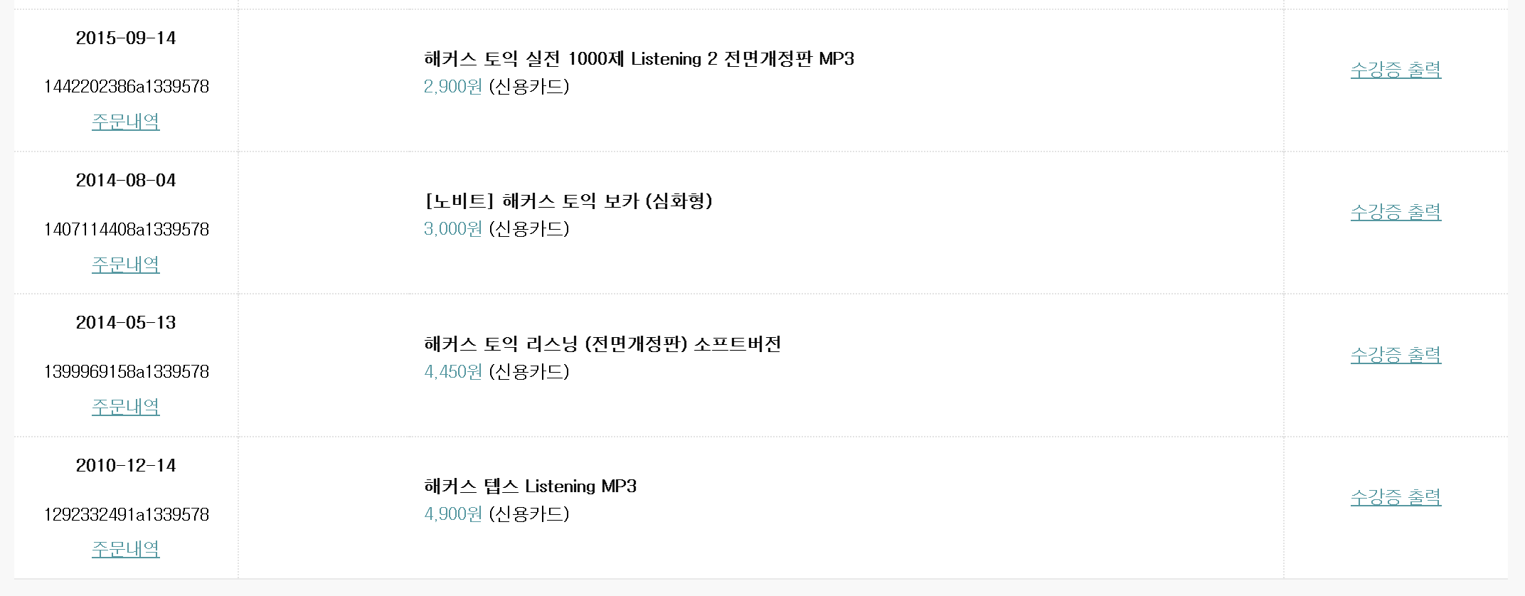 저는 2010년부터 텝스 시험을 시작으로 토익, 아일엘츠 계속 영어 공부와 시험을 진행하고 있습니다. 결제 내용에서 보신것처럼 15년 동안을 해커스와 함께 해왔습니다. 제가 계속해서 해커스를 찾는 이유는 제가 목표했던 점수를 획득했었고 만족했었기 때문입니다. 아이엘츠만 해도 만 5년이 넘었습니다. 5년 전 아이엘츠를 시작할때는 아카데믹을 공부했습니다. 직장 다니면서 틈틈히 공부하여 1년만에 원하는 점수를 획득했고, 계속해서 조금더 높은 점수를 획득하기 위해 계속 공부했었습니다. 2022년 새로운 목표를 가지고 캐나다 유학생활을 시작했습니다. 그때 필요했던 영어 점수는 해커스를 통해 획득했던 아이엘츠 점수로 가능했습니다. 그리고 지금까지 캐나다에서 공부를 하고 있습니다. 이 시점에서 다시 도전하고 있습니다. 졸업을 앞 둔 시점에서 이번에는 아카데믹이 아닌 제너럴 아이엘츠 공부를 시작합니다. 캐나다는 졸업후 3년 워크비자를 받을 수가 있습니다. 그 때 영어시험 점수를 제출해야 하는데 아이엘츠(제너럴)도 가능합니다. 그래서 또다시 해커스를 찾아와 공부하고 있습니다. 온라인 강의가 수 없이 많습니다. 제가 다른것은 듣지 못해 비교분석은 못하지만 해커스 온라인 강의는 충분히 훌륭합니다. 영어시험 특히, 아이엘츠를 도전하시다면 해커스 온라인강의로 시작해보세요. 불편 없는 서비스도 만족하실겁니다.