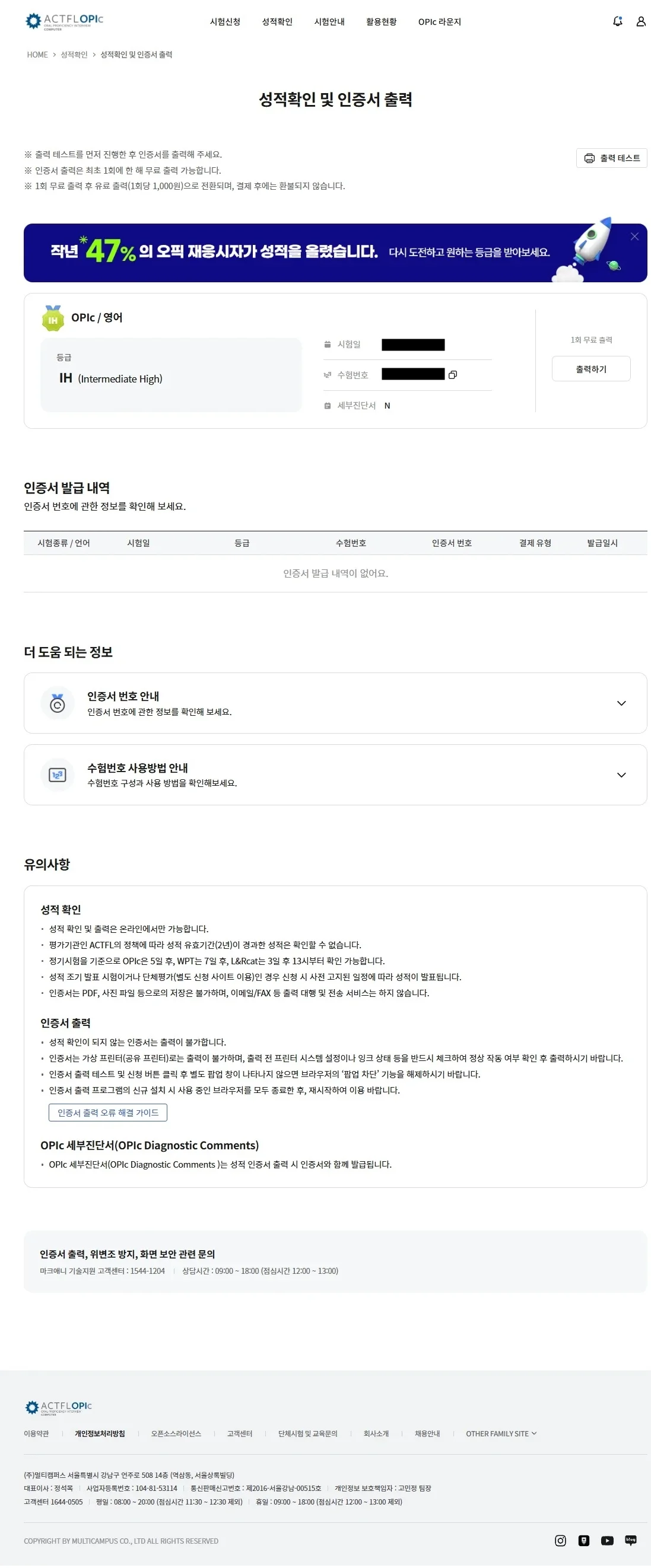 ㄴ 응시정보 및 인증서번호를 포함한 모든 정보가 육안으로 확인이 가능한 정규성적표이어야 합니다.